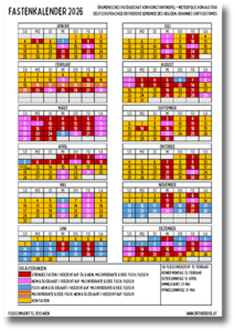 Das bewusste Gestalten der Fastenzeiten soll uns auch im Jahr 2026 eine Hilfe sein, unsere Beziehung zu Gott und zu unseren Mitmenschen zu vertiefen und zu verbessern. Einen Jahresüberblick über die Fastentage können Sie als pdf herunterladen und ausdrucken, indem Sie auf die Miniaturvorschau des Kalenders klicken:
